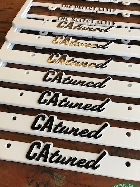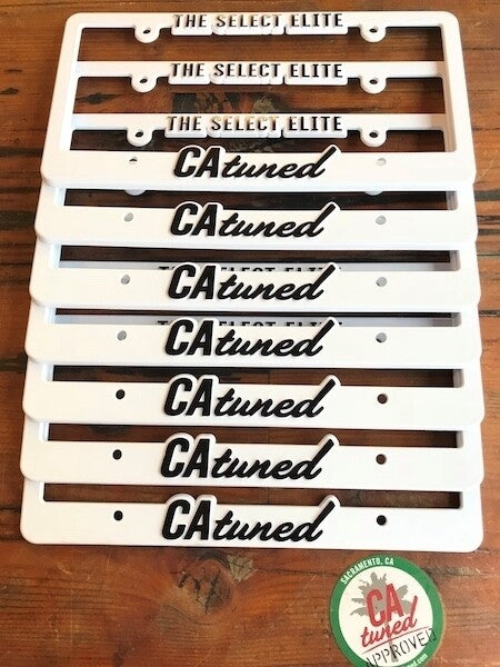 CAtuned Select Elite USA License Plate Frame- White w/ Black lettering Fits standard US license plates Dimensions: 6" x 12" One plate per order