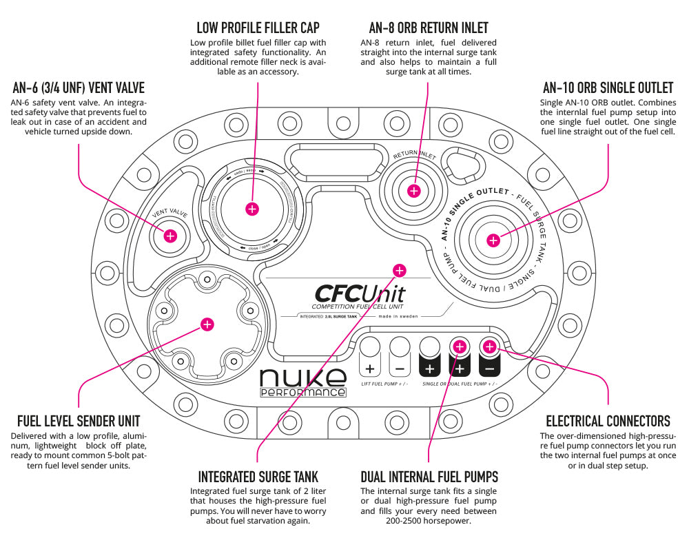 The CFC Unit works as a fuel pump hanger with an integrated surge tank for motorsports applications where safety and functionality are of uttermost importance. It is designed to mount directly to an aftermarket fuel cell with a standardized 24-bolt pattern. For more information about the functionality of the CFC Unit, view our Youtube video explaining its functions or visit our FAQ guidé that tells you more about the CFC Unit.