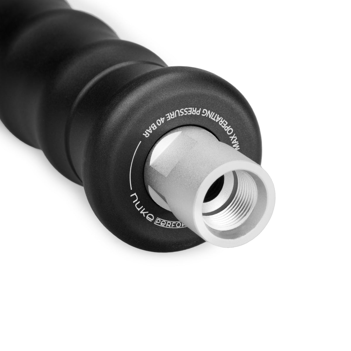 The louvered handle offers a firm, secure grip on the lightweight lance, ensuring optimal performance for lifting and lowering your vehicle in the pit lane or workshop. It easily connects to Nuke Performance connector valves (available here) and remains securely locked until the outer sleeve is pulled back. The Nuke Performance air jack lance is the perfect match for your onboard air jacks, compatible with both high and low-pressure versions.