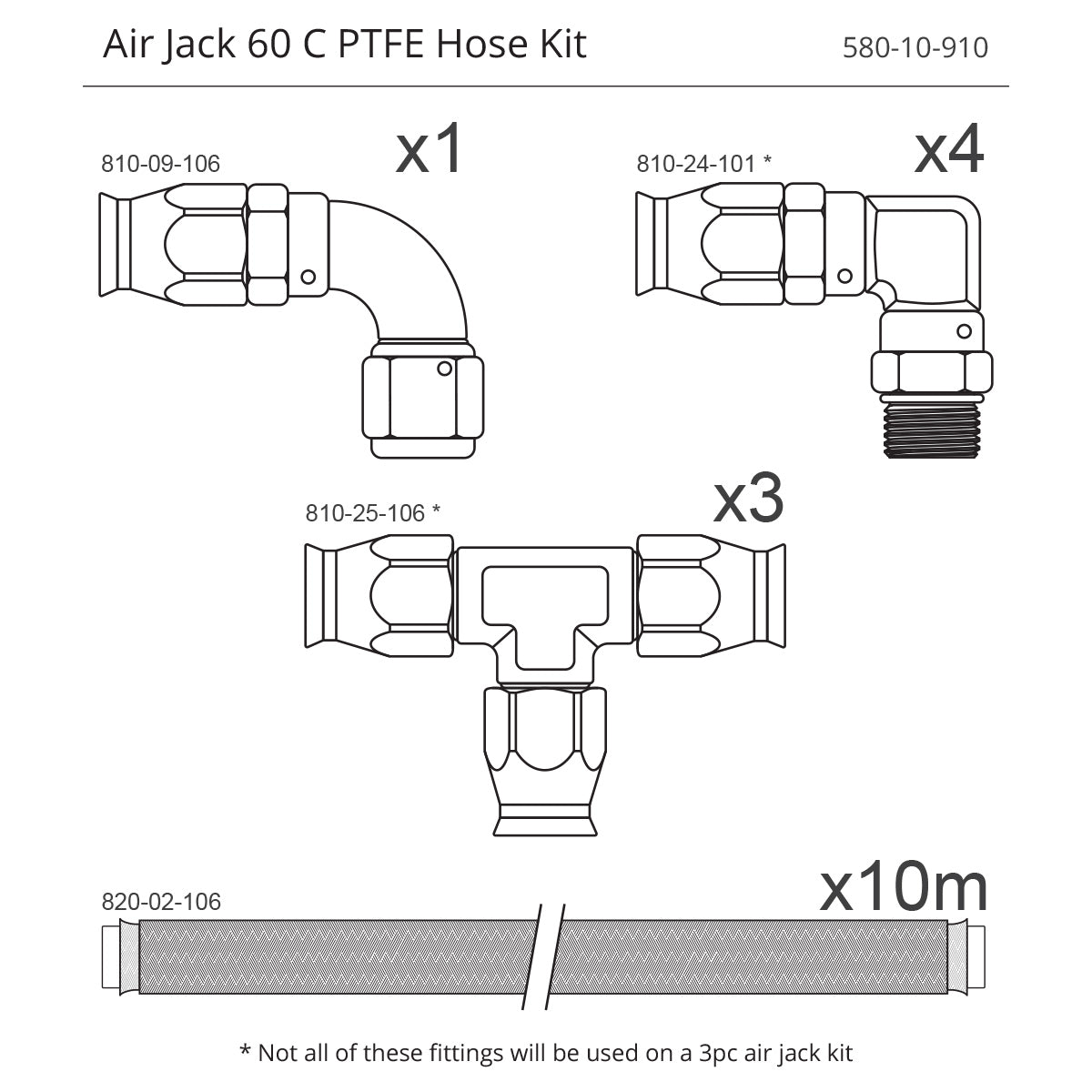 Installing the Nuke Performance Air Jack 60C air jacks is made simple with this PTFE hose kit, designed for 8-30 BAR (120-435 PSI). It includes everything you need for a 3 or 4-piece air jack setup, allowing a seamless connection between your chosen valve and the air jacks.