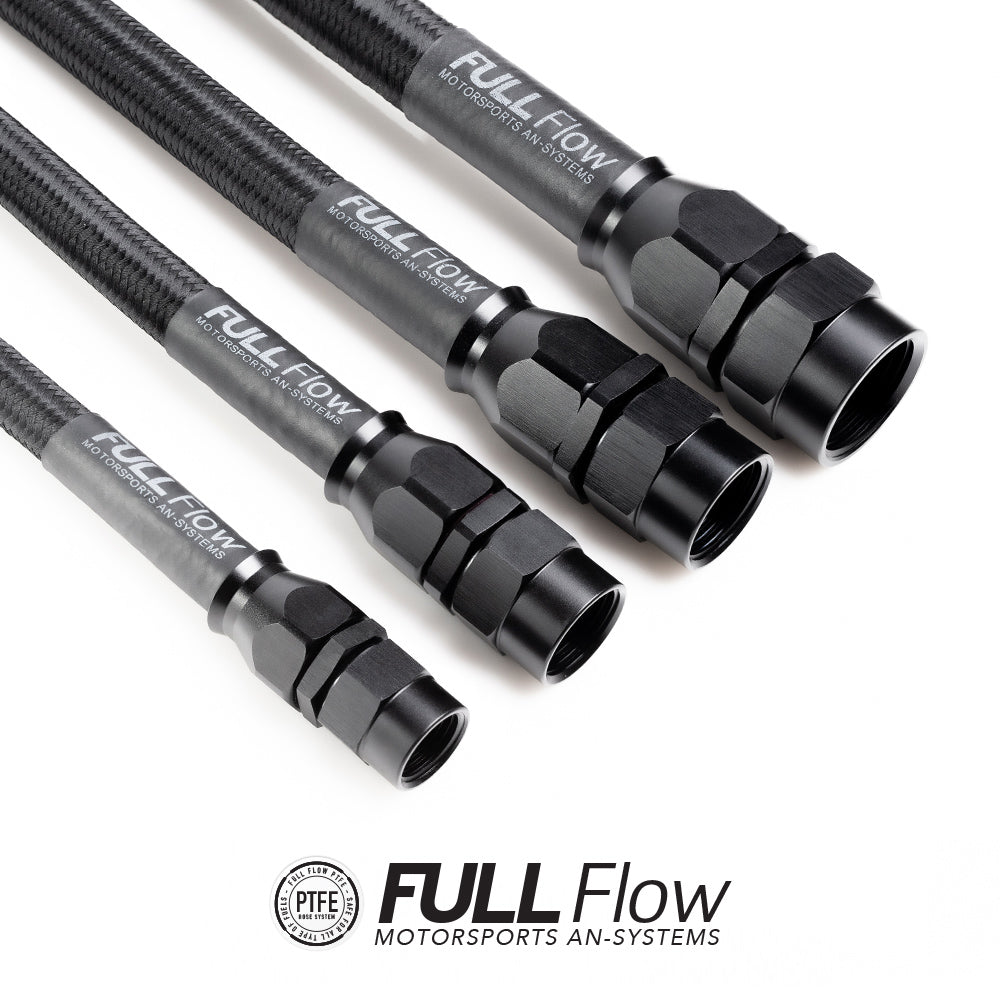 Nuke Performance Full Flow PTFE Hose End Fittings are available in AN-6, AN-8, AN-10, and AN-12. The matching braided PTFE fuel hose is available in pre-cut lengths of 1m, 2m, 4m, and 6m (3-20ft).