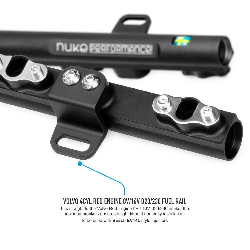 The Nuke Performance Volvo 4cyl Red Engine 8v/16v B23/230 fuel rail is delivered with brackets for the 4cyl Redblock 8v and 16v engines.
