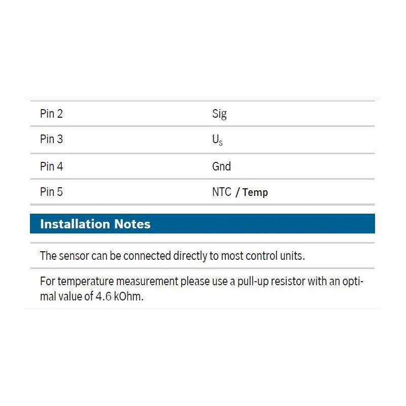 This sensor can be connected directly to most control units. For temperature measurement please use a pull-up resistor with an optimal value of 4.6 kOhm.